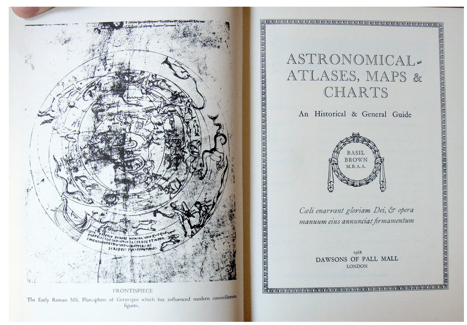 In 1932 Basil Brown published, ‘Astronomical Atlases, Maps and Charts’. It took him four years to write. Originally published by Search Publishing Co., it contained 200 pages, 19 plates and an impressive cover of brown and gold. That it originally sold for 18 shillings (£0.90) is astonishing when you observe that today, copies sell online for over £1000.00! The volume here is a later, reprinted edition published by Pall Mall in 1968. This originally sold for eight pounds and 10 shillings (£8.50).